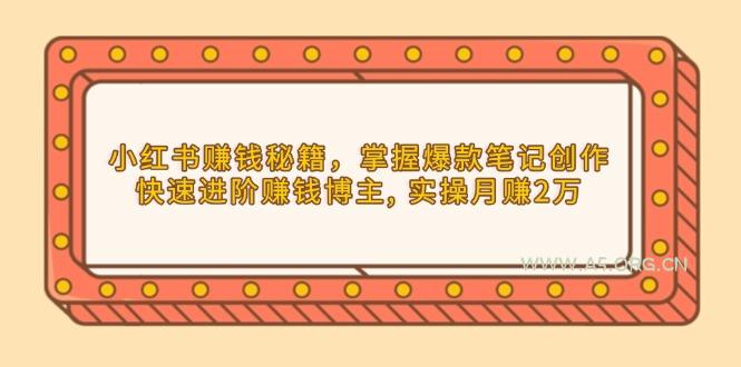 2025-01-02 创业项目 / 网赚项目 小红书赚钱秘籍,掌握爆款笔记创作,快速进阶赚钱博主, 实操月赚2万 by 三五一十八 课程内容: 1-第一讲:赚钱系统:每月收入额外增加50%,小白也能做小红书赚钱 2-第二讲:定位系统:粉丝反推法塑造账号及内容定位 3-第三讲:运营系统:15天打造出可快速接单的小红书账号 4-第四讲:创作系统:三招写出高质量的爆款笔记 5-第五讲:实操系统:小红书月赚20000的三个核心步骤 6-第六讲:规则系统:小红书的变现方式和接单渠道