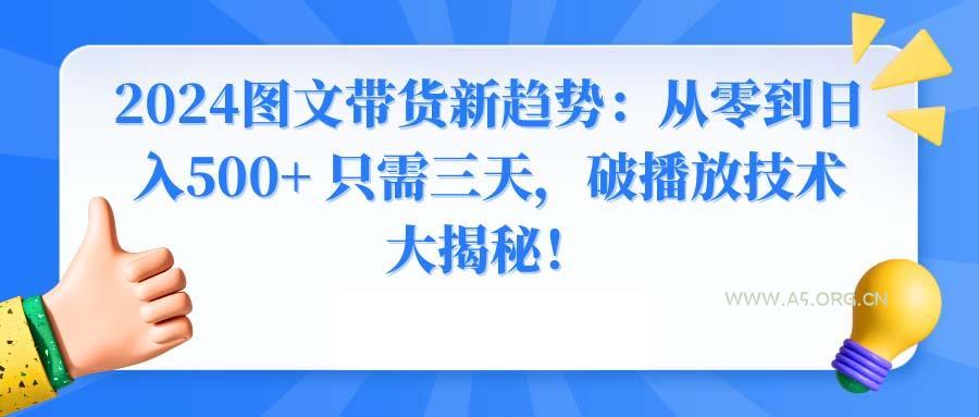 2024-02-05 带货技术 / 电商技术 / 网络技术 / 资源教程 2024图文带货新趋势:从零到日入500+ 只需三天,破播放技术大揭秘! by 三五一十八 项目介绍:你是否在图文带货中苦苦挣扎,销量与收益均不尽如人意?别担心,今天我们将为你揭示图文带货的爆单秘诀。这不仅仅是一个课程,更是一个改变你现状的机会。我们将直击你面临的三大痛点,让你轻松解决销量、收益、爆款的问题。达到快速出单的目标不再遥不可及。