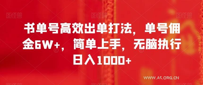2023-12-08 新媒体运营 / 网赚项目 书单号高效出单打法,单号佣金6W+,简单上手,无脑执行日入1000+【揭秘】 by 三五一十八 书单号高效出单打法,单号佣金6W+,简单上手,无脑执行日入1000+【揭秘】 项目介绍: 今日带来的项目是书单号的偏门玩法,只有一个目的,快速出单!不投流,0投入,只需要无脑执行力跟上,打造高效出单的账号!