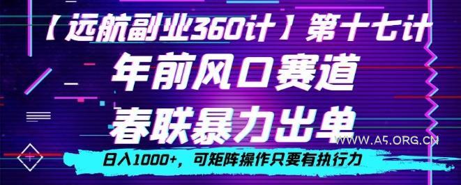 2023-12-24 新媒体运营 / 网赚项目 年前风口赛道,春联暴力出单,日入1000+,可矩阵操作只要有执行力 by 三五一十八 年前风口赛道,春联暴力出单,日入1000+,可矩阵操作只要有执行力 磁力春联的优势在于易于粘贴,同时避免了内部竞争。由此,我们的销量直接就上去了,比其他产品更省事,只要你的执行力到位,一天1000加是没有任何问题的,所以说大家一定要去抓住这波风口,春联的利润基本在3倍—5倍 1.项目介绍 2.操作流程 3.注意事项