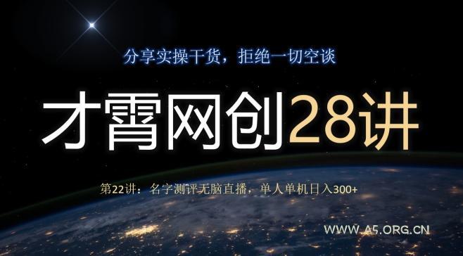 2023-12-02 新媒体运营 / 网赚项目 才霄网创28讲第22讲:名字测评无脑直播,单人单机日入300 by 三五一十八 才霄网创28讲第22讲:名字测评无脑直播,单人单机日入300 这一讲分享的是一个零成本的好项目,该项目无需引流,借助抖音这个平台实现空手套白狼,经过实操测试,单人单号可以达到日入300+