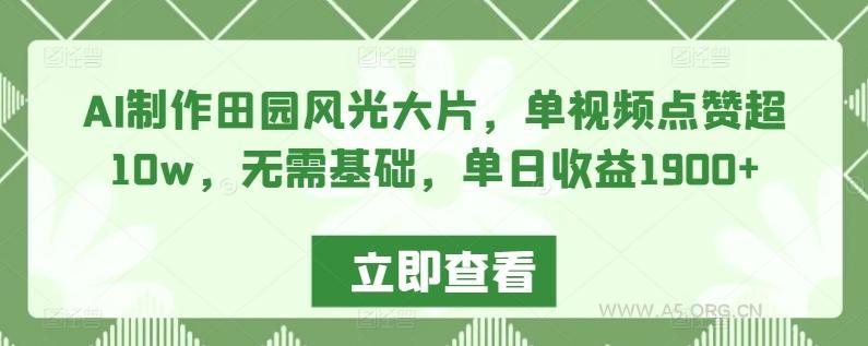 2024-03-05 AI技术 / 新媒体运营 AI制作田园风光大片,单视频点赞超10w,无需基础,单日收益1900+【揭秘】 by 三五一十八 AI制作田园风光大片,单视频点赞超10w,无需基础,单日收益1900+【揭秘】 这个项目是利用AI制作田园风光动图视频,大家在短视频平台上经常看到这类充满了田园风光的视频,视觉效果震撼,这种利用AI制作的田园风光视频,节奏相对舒缓,看似平淡,却能够巧妙地利用情绪价值来吸引观众的共鸣和评论区互动。这类账号吸粉和变现能力也都非常出色。