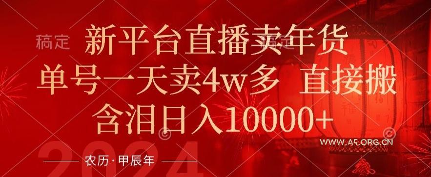 2024-01-22 新媒体运营 / 直播技巧 年末红利来了,新平台直播卖年货,单号一天卖4w多,话术场景直接搬,含泪日入1w+【揭秘】 by 三五一十八 年末红利来了,新平台直播卖年货,单号一天卖4w多,话术场景直接搬,含泪日入1w+【揭秘】 同样是直播带货,今天分享的玩法绝对符合当下 旺季马上到来,现在正是布局的好时机 春联,灯笼,挂件,全部都是春节相关的产品,直播间氛围拉满,转化奇好 去年就在做的,今年也开始布局完成,现在可以分享了,进场吃肉日入5000+